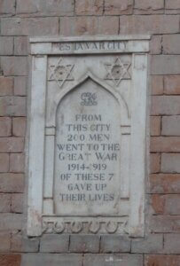 They are also remembered in their hometowns and cities. In the Northwest Frontier city of Peshawar, a small memorial in the centre of the old walled city commemorates the 200 men who volunteered for the war and the 7 who never came back. In Karachi a large cenotaph stands marking the sacrifice made by over 650 men from the Baluch Infantry who fought and died in France, Egypt, Mesopotamia, Persia and Palestine.